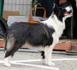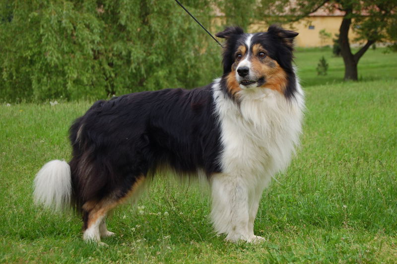 A fekete-fehér színkombináció mellett talán a fekete-fehér-cser szőrzet a leggyakoribb, azaz rövidebb nevén a trikolor szín. Ennek egyik változata a "saddle patterned", azaz nyergesen mintázott szőrzet, amikor a fekete szín, a német juhászkutya szőrzetéhez hasonlóan, nagy nyerget alkot a háton. A trikolor gén recesszív, tehát ilyen fajta egyedek akkor fordulhatnak elő, ha mindkét szülő hordozza magában és a két trikolor gén találkozik egymással. Az esetek nagy többségében e két gén találkozásakor szinte csak trikolor kölykök jönnek napvilágra.